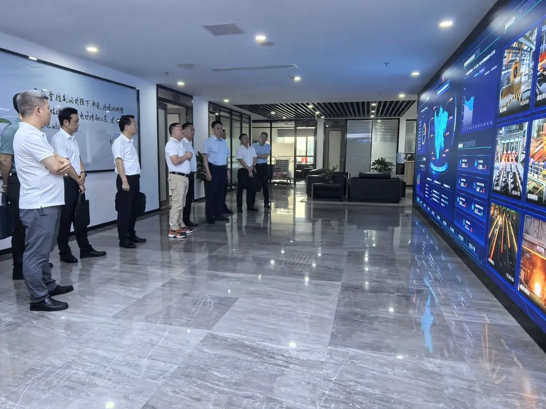 在冶控集团总部,余先河一行听取了冶控集团总裁陈献对集团发展历程、核心优势、绿色转型、各个基地等情况介绍,并在集团总部显示屏前观摩了九个基地的实时生产现场。