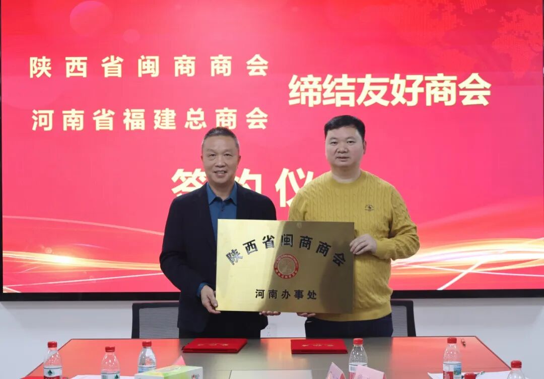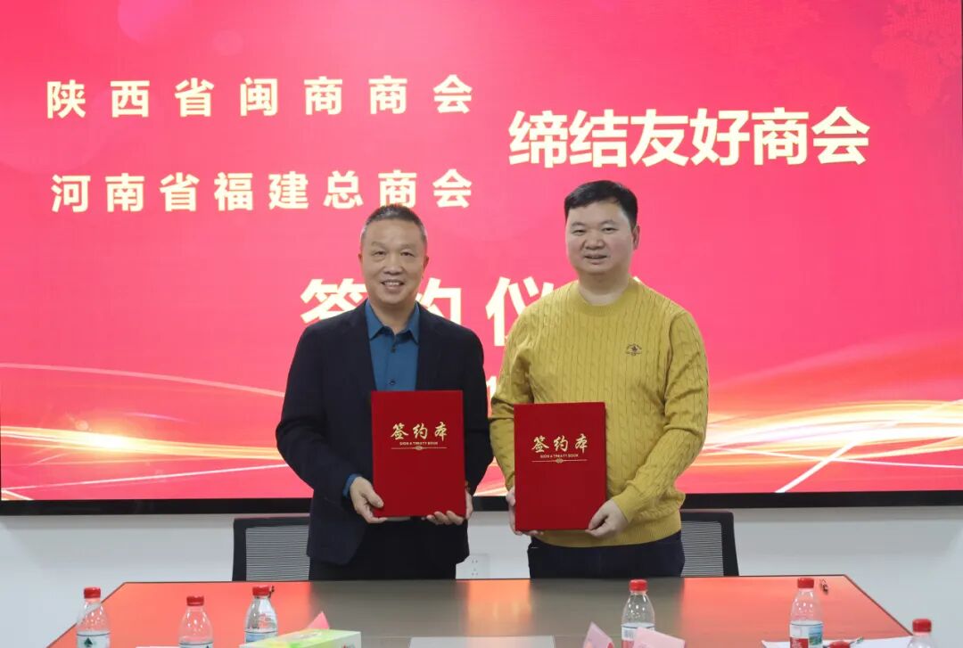 吴文辉会长与陕西省闽商商会会长朱梅元代表双方单位签订缔结友好商会协议。