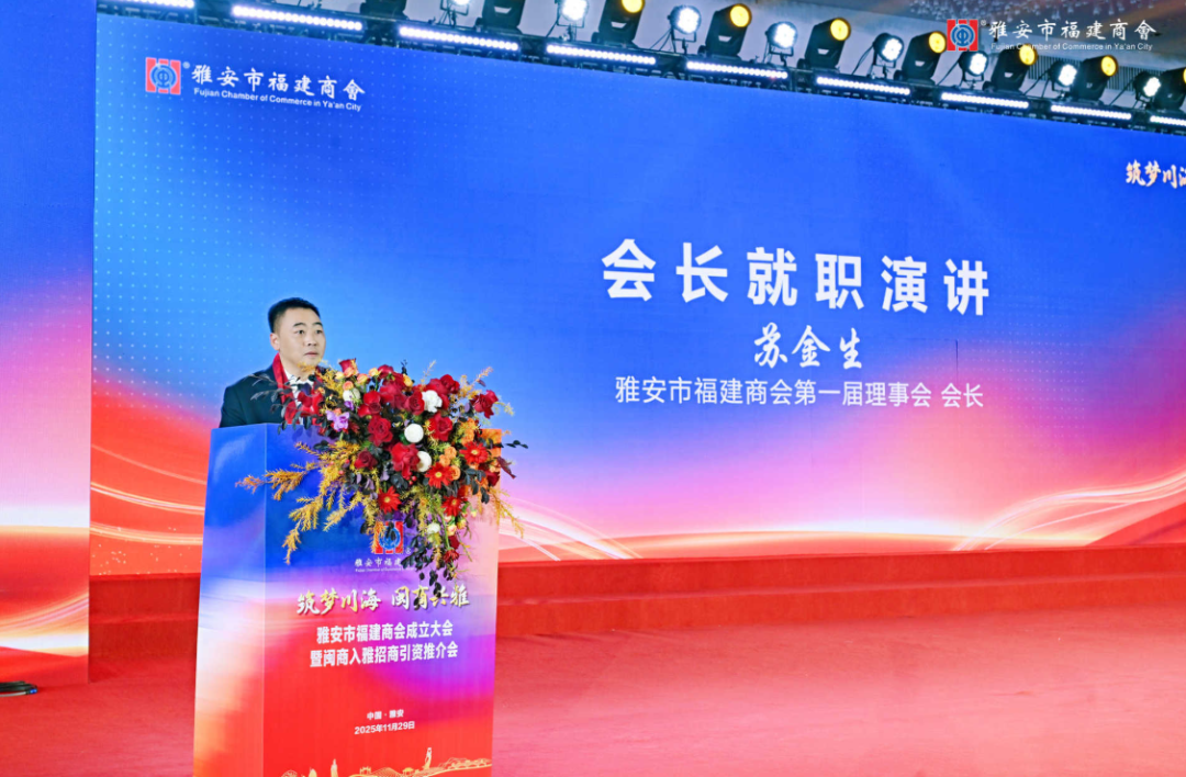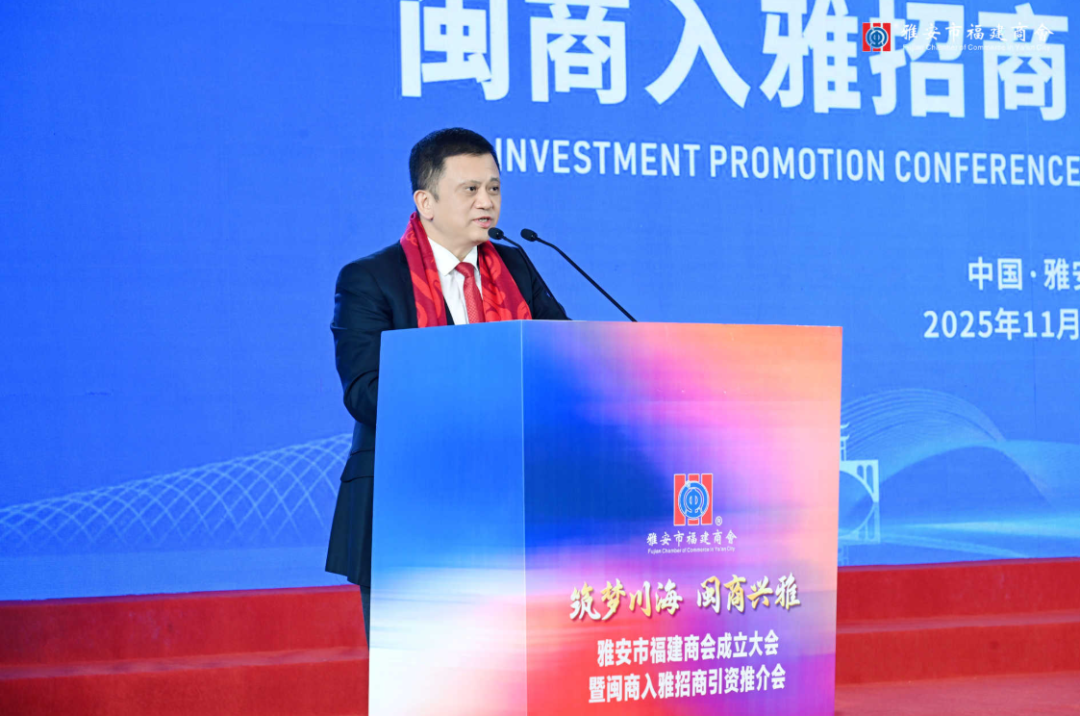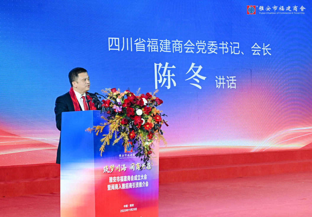 “筑梦川海 闽商兴雅”。11月29日至30日,雅安市福建商会成立大会暨闽商入雅招商引资推介会在雅安市皇冠假日酒店盛大举行。中国社区发展协会会长陈越良,福建省工商联党组成员、专职副主席余建,四川省工商联二级巡视员杨东,雅安市委常委、统战部部长李蓉,雅安市委常委、市国资委党委书记何连俊,雅安市政协副主席、市工商联主席杨力,雅安市委社会工作部部长何雨珂,雅安市委统战部副部长、市工商联党组书记李明基;雅安市各区(县)人大、政协、统战、工商联相关领导;四川省福建商会党委书记、会长陈冬,商会监事长、四川冶控集团董事长刘义腾,商会名誉会长、云南省福建总商会会长谢国华,商会名誉会长、重庆市福建商会会长黄怡霖,商会名誉会长、新疆福建商会会长何明清,商会名誉会长、新疆生产建设兵团福建商会会长黄阿德,商会党委副书记、执行会长翁荣传,党委直属支部书记、执行会长徐梁,商会战略咨询委员会主任、成都侨商会会长洪清鹏及商会相关常务副会长、副会长、秘书长;四川省福建商会常务副会长、雅安市福建商会会长苏金生及班子成员;来自北京、重庆、云南、陕西、西藏、新疆、新疆生产建设兵团等商(协)会会长及代表;云南省福建总商会慈善基金会会长陈先权,泉州市人民政府驻成都办事处主任杨群晖等嘉宾共500余人参加大会。四川省福建商会党委书记、会长陈冬分别在闽商入雅招商引资推介会上分享在川闽商投资兴业情况,在雅安市福建商会成立大会上致辞祝贺。
