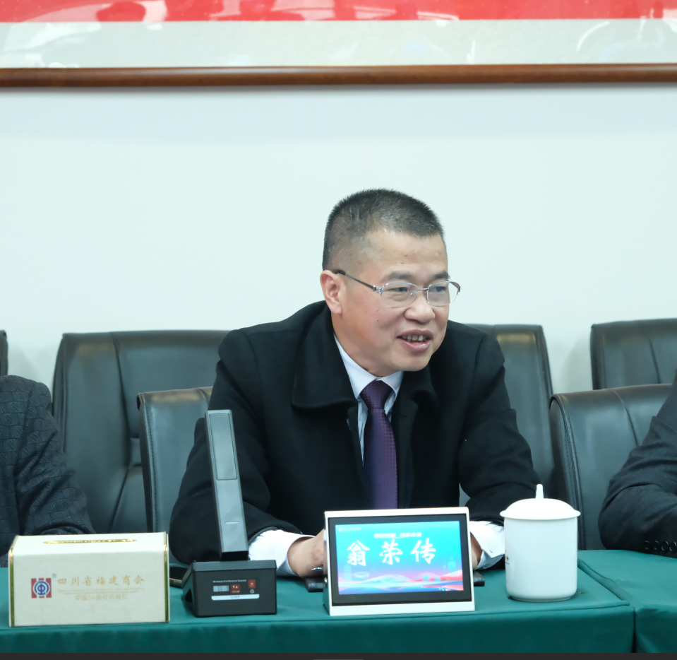 翁荣传就来宾关切的商会机构职能、会务工作和党建工作的创新进行解析。他表示,四川省广东商会凝聚广大在川粤商的智慧和力量,为四川的经济社会发展作出了积极的贡献,树立了新时代粤商的良好形象。他指出,闽粤不仅在地理上相连,更在文化上紧密相连。闽粤在人文信仰、风俗习惯等许多方面基本一致,尤其在民间信仰体系、饮食文化与家风传承、宗族观念等方面表现出“同源共流”的特征,自古就有“闽粤一家”的说法。翁荣传表示,四川省广东商会有许多值得学习的特色和亮点,希望两家兄弟商会加强联络与互动交流,互相学习和促进,资源共享,共同为商会会员企业发展赋能增效;以改革创新精神加强商会建设,携手开展党建合作共建工作,以党建促会建;共同致力地方经济建设、社会发展和文化交流互鉴,共享发展机遇,同肩时代大梁!