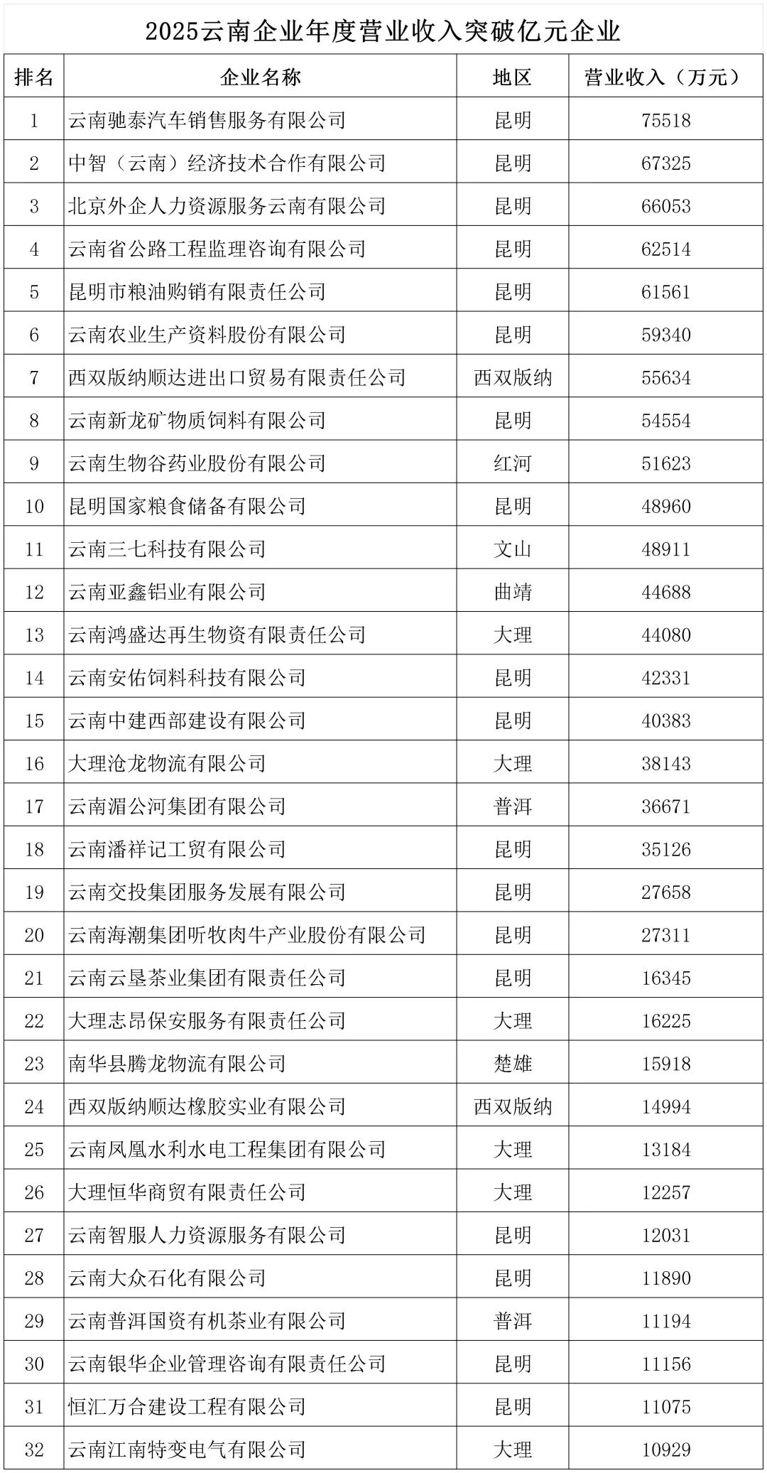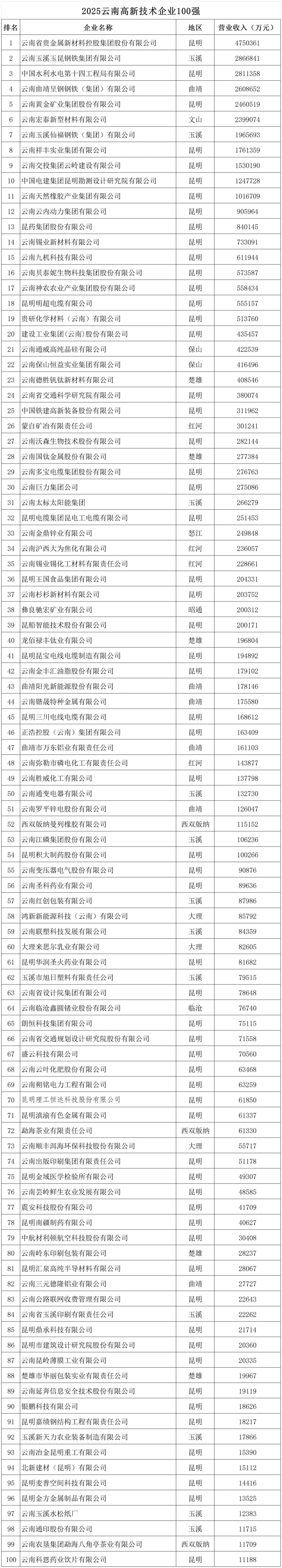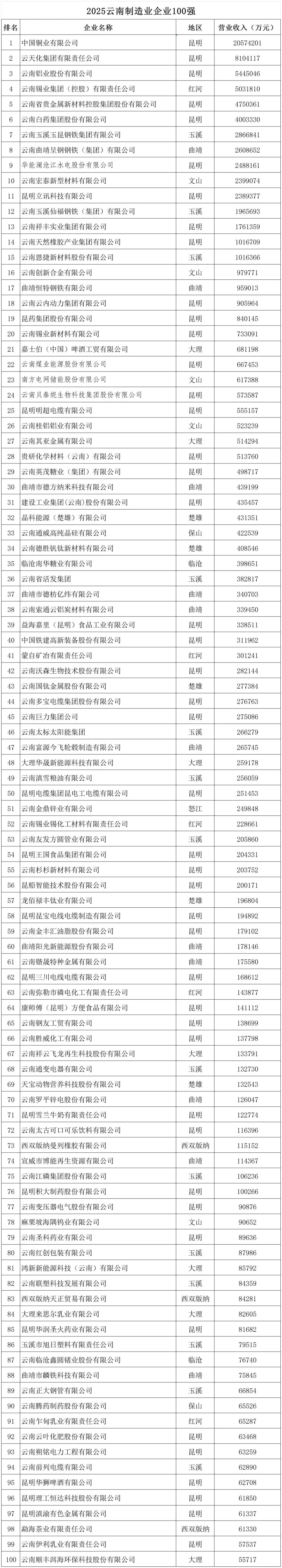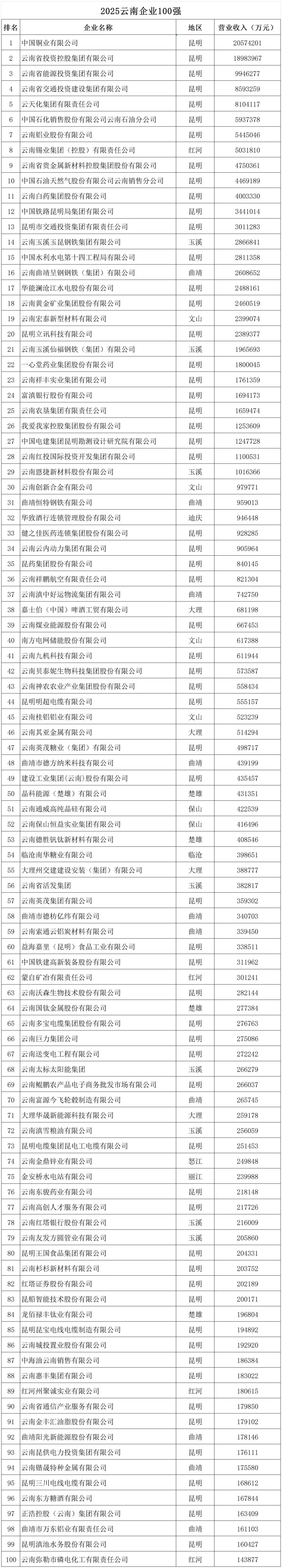 报告显示,2025云南企业100强营收总额达16054.94亿元,入围门槛14.39亿元。从头部企业看,中国铜业有限公司以2057.42亿元营收蝉联榜首,云南省投资控股集团以1898.40亿元位列第二;营收超千亿企业共2家,超百亿企业增至29家(新增4家均来自制造业),“头部集中、腰部壮大”的格局初步形成。值得关注的是,83家企业实现营收正增长,15家增速超20%,新能源、新材料领域成为增长主力。