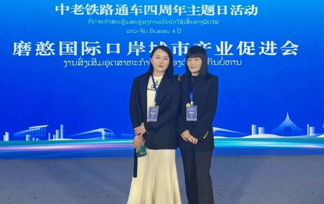 ▲云南省福建总商会执行会长兼妇委会主席吴莉蓉(左一),总商会副秘书长兼妇女联合会执行主席陈凌玲(右一)应邀参加中老铁路通车四周年主题日活动暨磨憨国际口岸城市产业促进会。