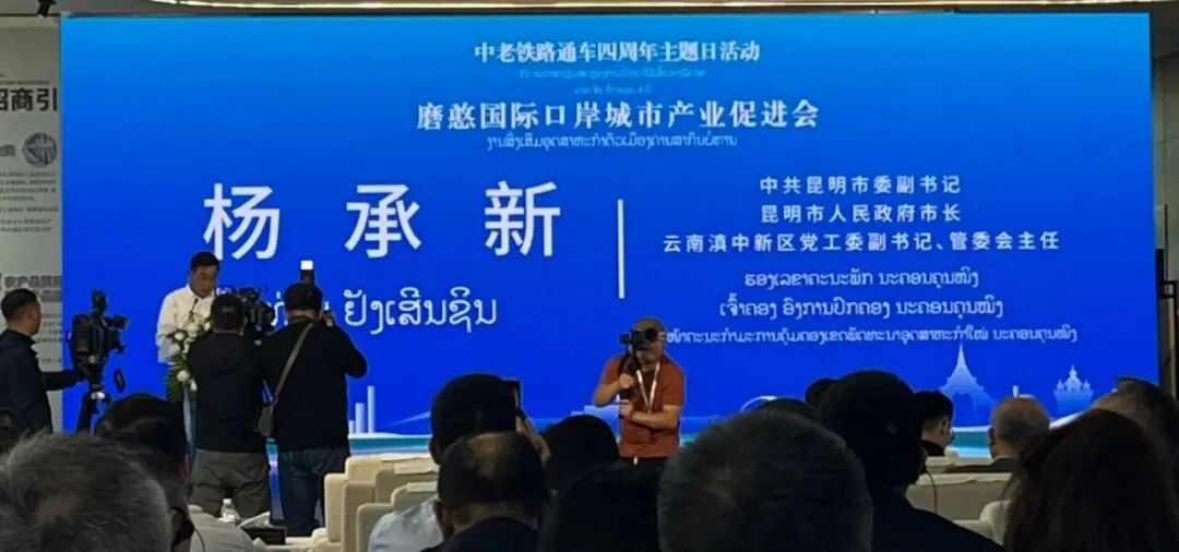 2025年12月9日,中老铁路通车四周年主题日活动暨磨憨国际口岸城市产业促进会在磨憨—磨丁合作区南坡国际产业示范园隆重举行。云南省委副书记、昆明市委书记刘洪建出席并致辞,市委副书记、市长杨承新主持,昆明市杨越远、刘申寿、陈凯杰、梁崑、王云林、陈瑞斌、郭颖、赵文参加活动。戴惠明作招商推介,赵明商作专题推介。同时,老挝有关部门、地方政府单位及驻昆总领事,云南省级有关部门和有关州市负责同志,福建泉州时尚产业联盟、老挝BN公司等中老两国企业负责人齐聚一堂,共话合作新篇。