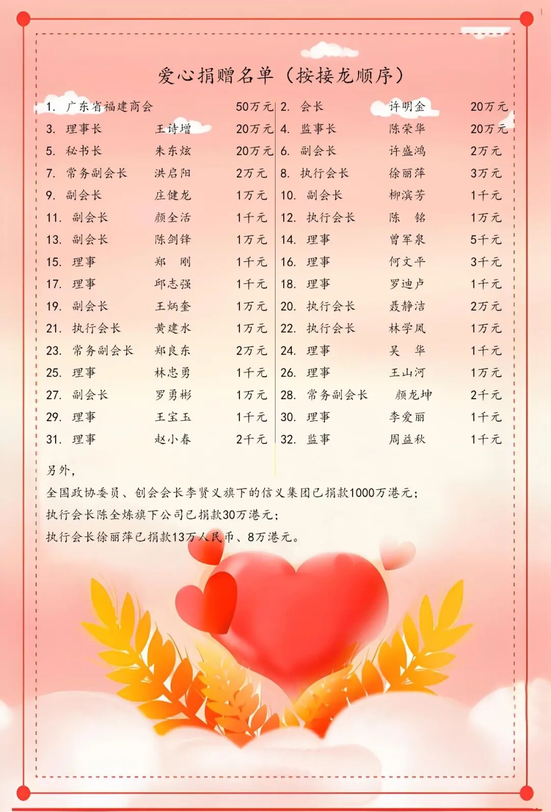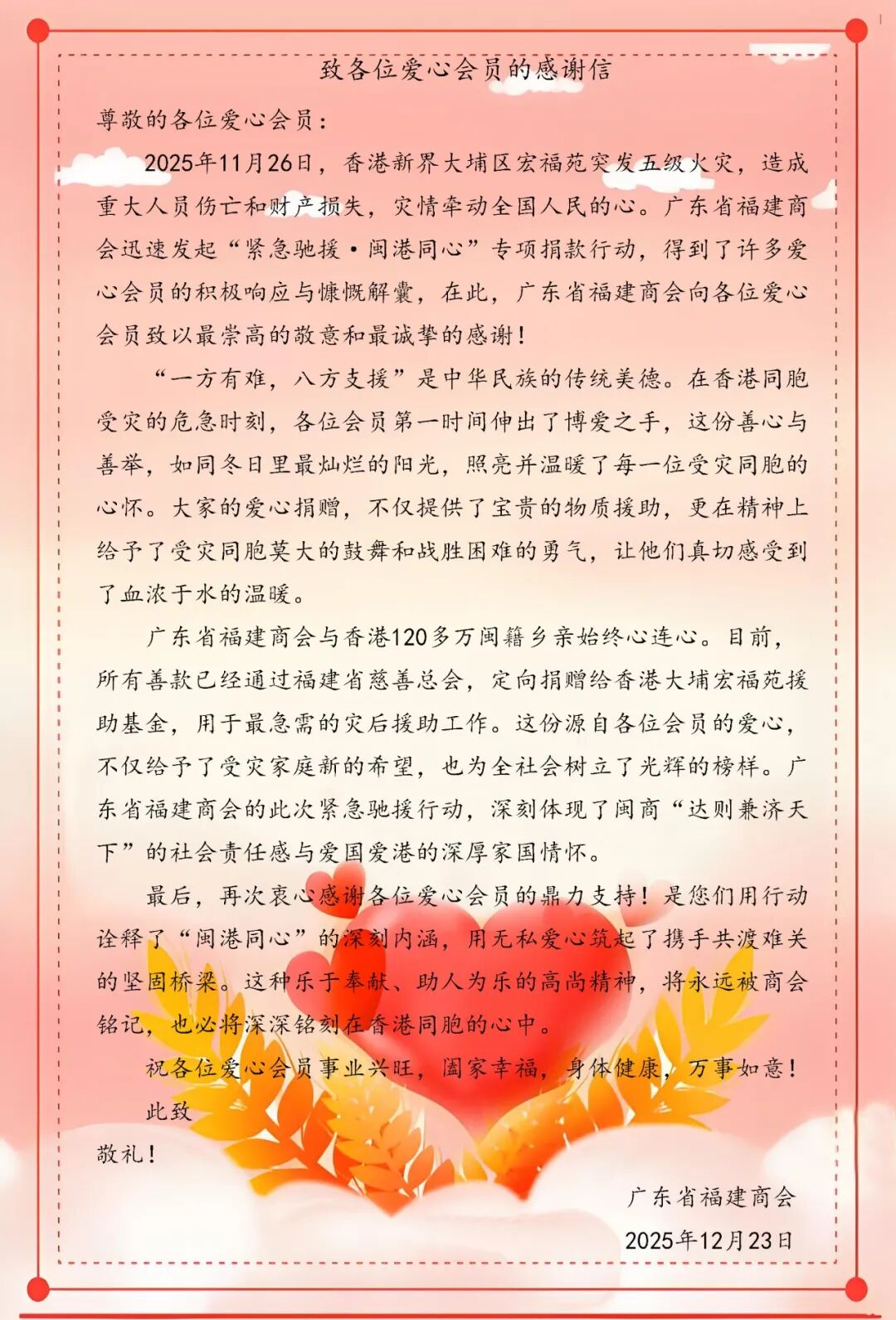 11月26日,香港新界大埔区宏福苑多栋住宅楼突发五级火警,造成重大人员伤亡和财产损失。灾情牵动全国人民的心。广东省福建商会及会员共捐赠1200多万元,帮助香港同胞共渡难关。