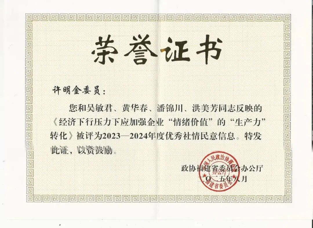 福建省政协对2023-2024年度反映社情民意信息的工作先进单位、先进个人和优秀社情民意信息进行了表彰。全国政协委员、会长许明金等人反映的《经济下行压力下应加强企业“情绪价值”的“生产力”转化》,被评为2023-2024年度优秀社情民意信息,荣获表彰!