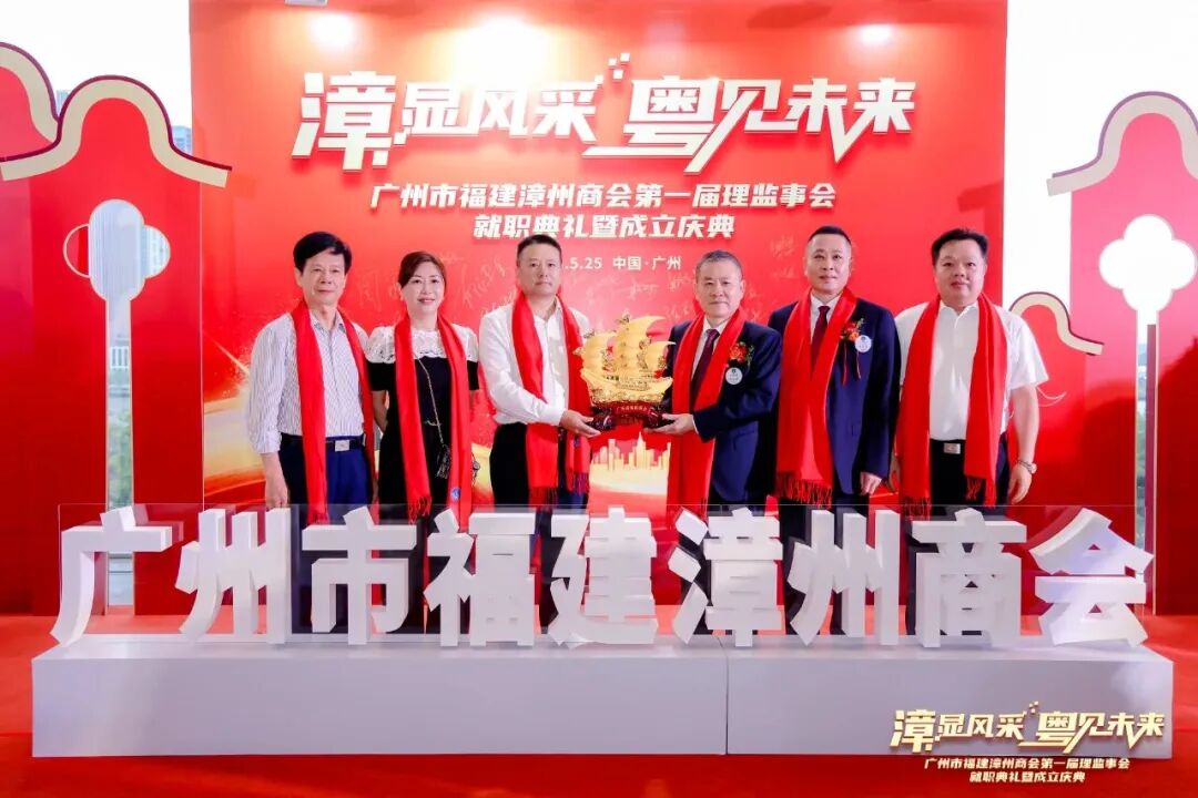 秘书长朱东炫(左3),执行会长郑炘茹(左2),常务副会长颜龙坤(右1)代表广东省福建商会,向广州市福建漳州商会赠送纪念品