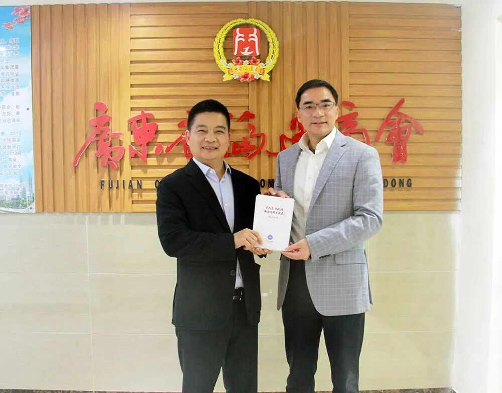 广东省工商联向广东省福建商会赠送惠企政策汇编,右为广东省工商联党组成员、秘书长关向明,左为广东省福建商会执行会长陈铭