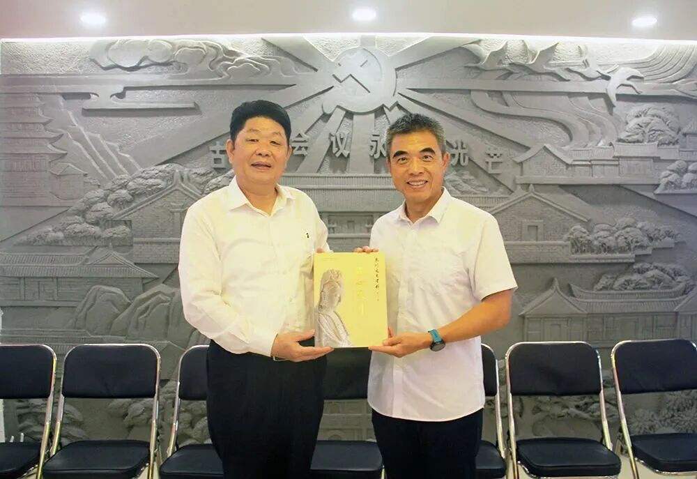 泉州市副市长姚飞向广东省福建商会赠送泉州文史资料,全国政协委员、会长许明金代表商会接收资料