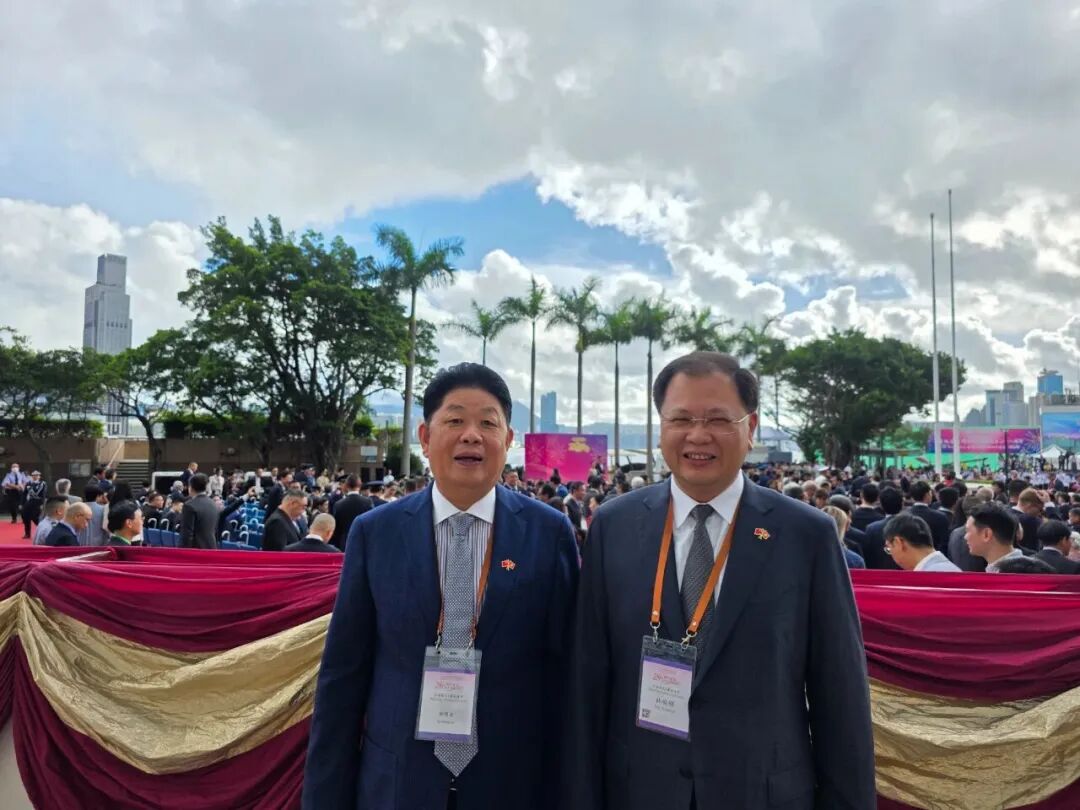 全国政协委员、广东省福建商会会长、香缤集团董事长许明金(左)和全国政协委员、伟禄集团、先施主席林晓辉(右)在升旗现场合影留念