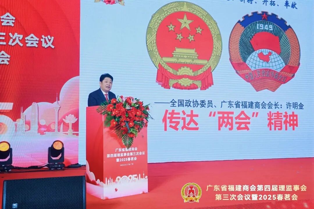 2025年3月15日,广东省福建商会在广州市白云国际会议中心国际会堂白云厅召开第四届理监事会第三次会议暨2025春茗会。全国政协委员、会长许明金在会上向大家传达全国两会精神。