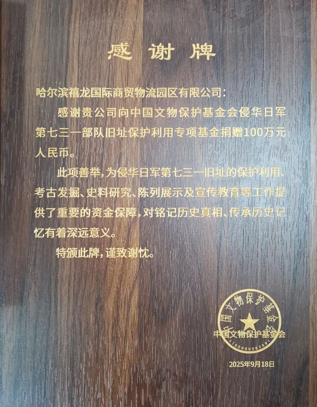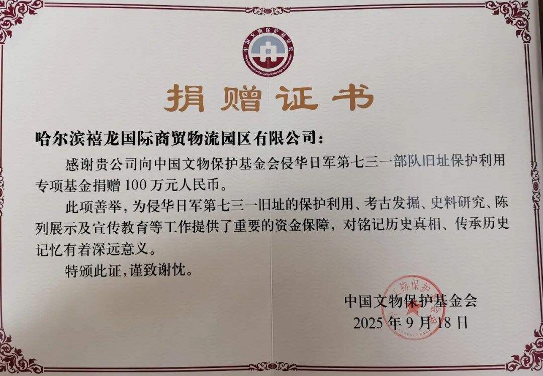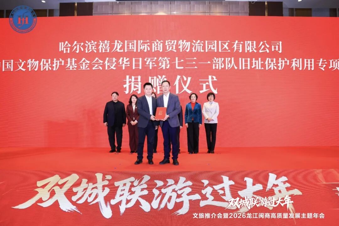 中国文物保护基金会向禧龙授予感谢牌和捐赠证书,感谢禧龙为侵华日军第七三一部队旧址的保护利用、考古挖掘、史料研究、陈列展示及宣传教育等工作提供的资金保障,表彰禧龙对铭记历史真相、传承历史记忆的贡献。哈尔滨市文化广电和旅游局局长王洪新登台向哈尔滨禧龙负责人颁授了饱含敬意的感谢牌与捐赠证书,代表这座城市铭记闽商的爱国赤子之心,感谢闽商对哈尔滨红色文旅付出的涓涓情怀。