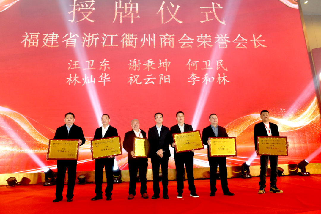 (衢州市副市长郑河江给荣誉会长汪卫东、谢秉坤、何卫民、林灿华、祝云阳、李和林授牌)