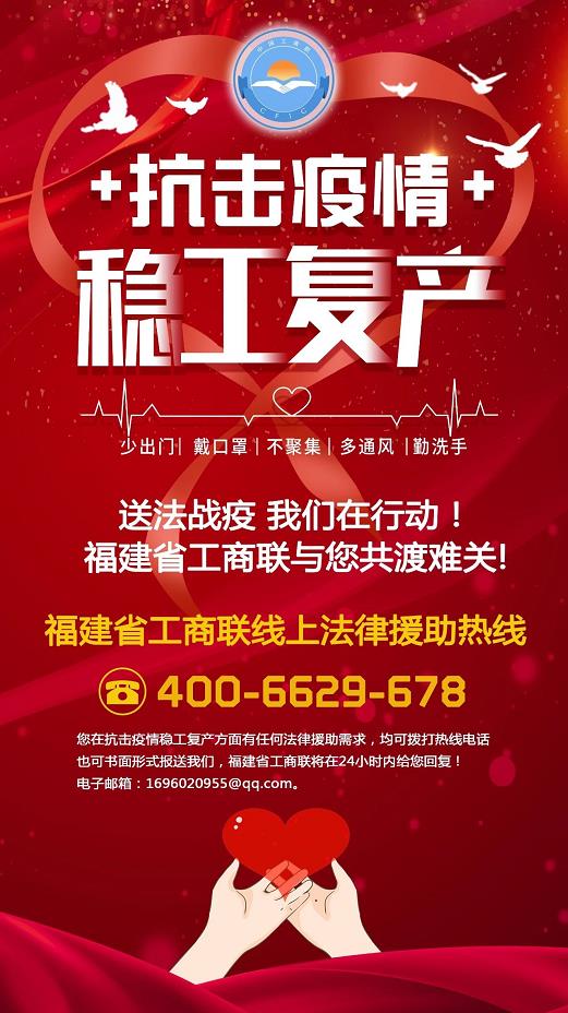 二是开通热线“暖”企。为帮助疫情时期民营企业渡过难关,福建省工商联法律维权服务中心联合北京乾成(福州)律师事务所、福建重宇合众(福州)律师事务所、拓维律师事务所、福建闽润律师事务所、中国国际经济贸易仲裁委员会福建分会等单位,专门组建法律援助律师服务团队,自2月13日起,专门开通法律援助专线400-6629-678,向民营企业承诺“送法战‘疫’,我们在行动,福建省工商联与您共渡难关!”。每日在线为企业解答和处理劳动用工、合同履约、商事纠纷、金融借贷问题、商事仲裁等方面的法律问题。热线开通以来,共接听企业来电100余次,及时受理和回复13个方面的法律问题。