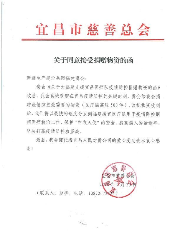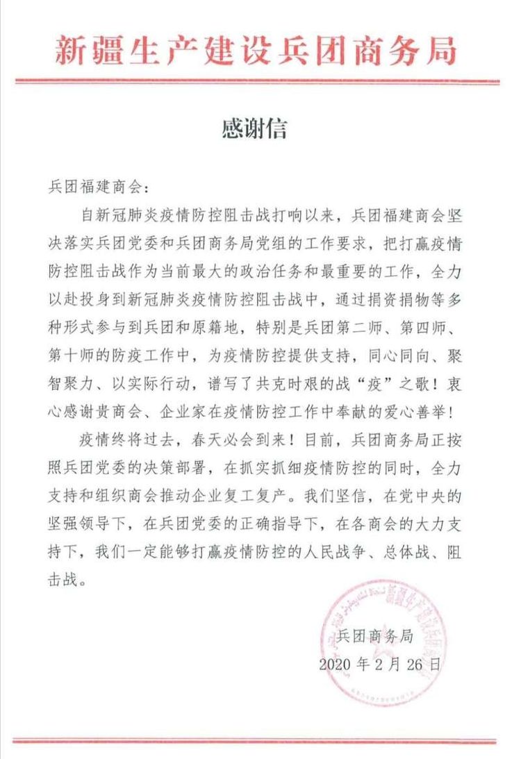 防控疫情,人人有责。此次捐赠物资也表达了兵团福建商会对福建及武汉宜昌疫情防控一线的工作人员坚守岗位,不惧危险,无私奉献,勇于担当的优良作风致以衷心的问候和深深的敬意。