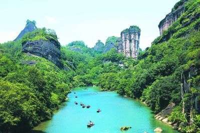 这几天酷暑难当,武夷山景区迎来暑期旅游高峰,中外游客纷纷选择乘竹筏游览九曲溪。图为11日,游人乘竹筏在九曲溪漂流。