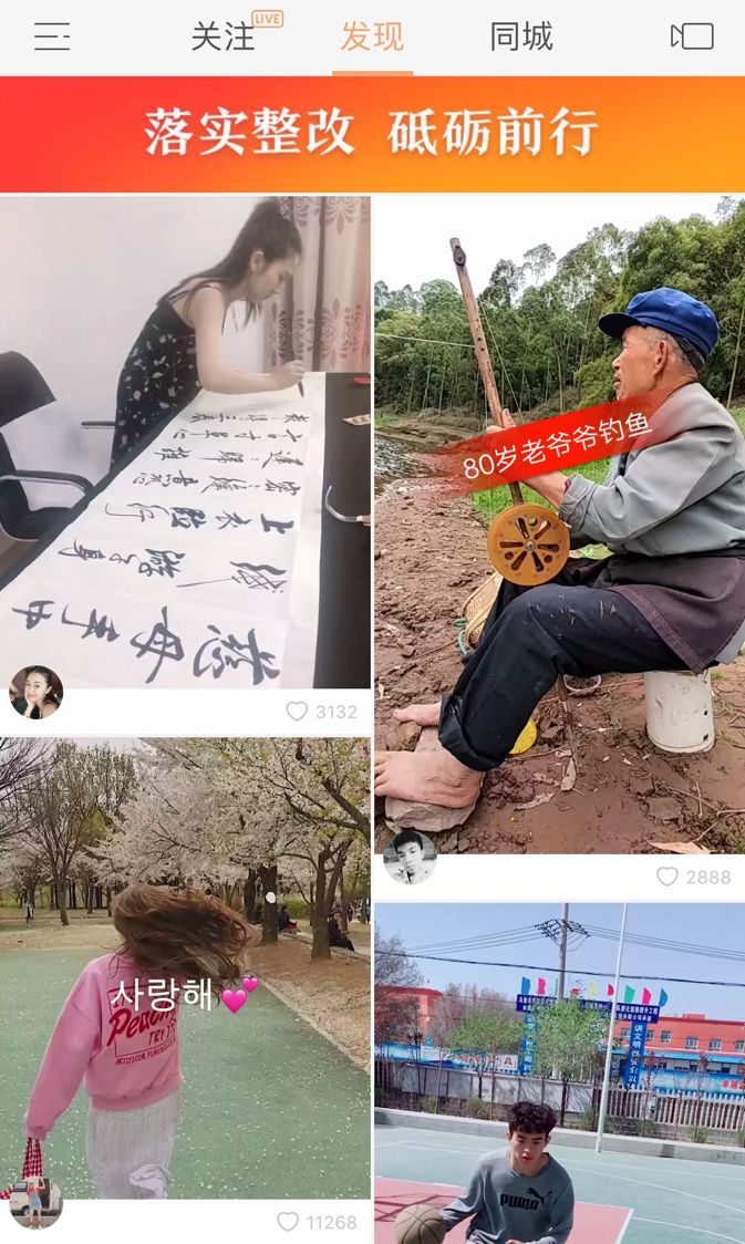 打开整改后的快手,「落实整改 砥砺前行」的字样依然在发现页置顶,视频也多为阳光健康的各类生活内容。