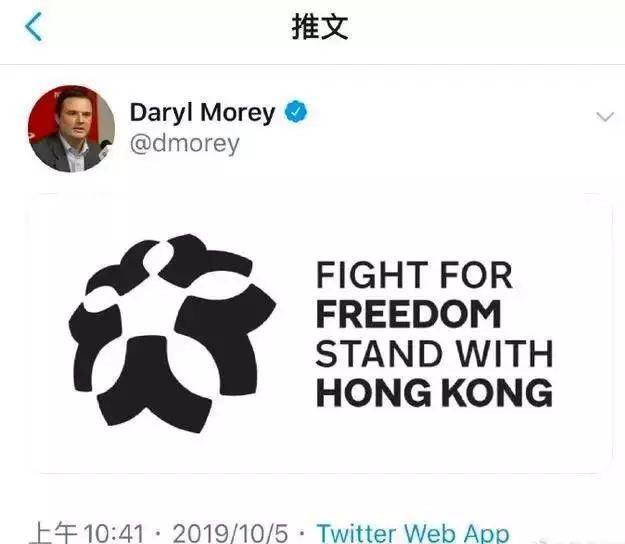 据人民日报客户端报道,此前,美国NBA休斯敦火箭队总经理莫雷发推称:Fight for freedom, Stand with Hongkong(为自由而战,和香港在一起)。这是香港极端暴力分子的口号,是对中国球迷的伤害,也是对中国人民的冒犯。