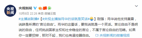 央视新闻率先发声。对亚当·肖华声称支持莫雷自由表达权利的说辞,我们予以强烈不满和反对。