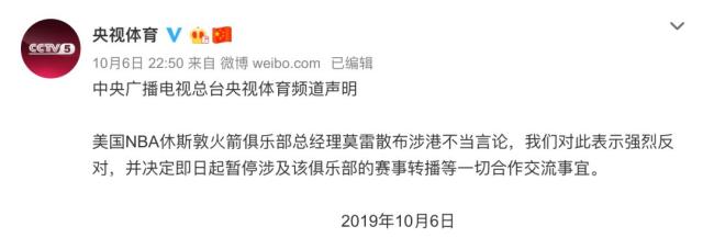 10月8日,中央广播电视总台央视体育频道再次针对上述事件发表声明称,决定立即暂停NBA赛事转播安排。