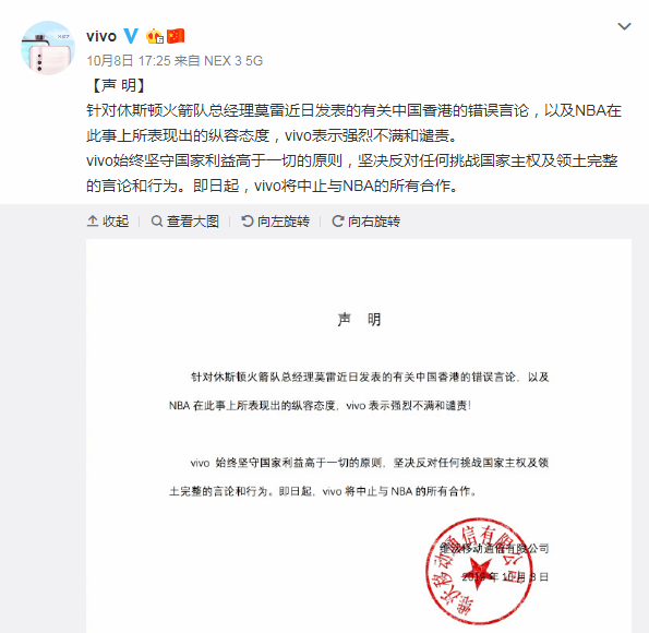 “针对休斯顿火箭队总经理莫雷近日发表的有关中国香港的错误言论,以及NBA在此事上所表现出的纵容态度,vivo表示强烈不满和谴责。vivo始终坚守国家利益高于一切的原则,坚决反对任何挑战国家主权及领土完整的言论和行为。即日起,vivo将中止与NBA的所有合作。 ”vivo在一份公开声明中称。