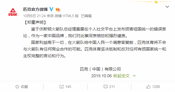 10月6日晚,匹克官方微博发布郑重声明称,在火箭队给中国人民一个满意答复前,匹克体育将不会与火箭队有任何商业合作的可能。