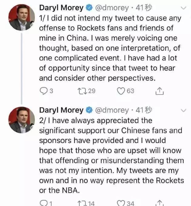 “我一直赞赏中国粉丝和赞助商的大力支持,我希望那些失望的人能明白,冒犯或者误解并非我的本意。我的推特只代表我本人,绝不代表火箭队或者NBA。”在回应中,莫雷只字未就错误言论道歉。