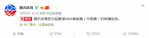 腾讯体育在官方微博宣布,腾讯体育即日起暂停NBA季前赛(中国赛)的转播安排。