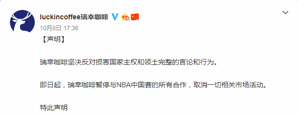 luckincoffee瑞幸咖啡10月8日在官方微博发表声明,瑞幸咖啡坚决反对损害国家主权和领土完整的言论和行为。即日起,瑞幸咖啡暂停与NBA中国赛的所有合作,取消一切相关市场活动。