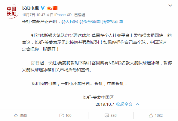 长虹发布声明,将暂时下架并召回所有NBA联名款火箭队球迷冰箱,暂停火箭队球迷冰箱相关市场活动和宣传。