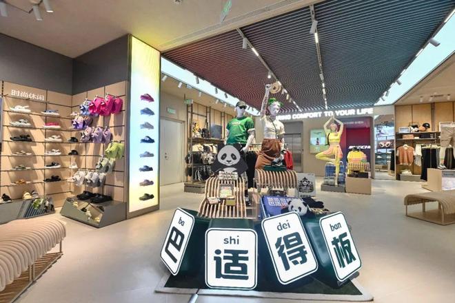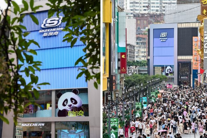 斯凯奇在去年于成都春熙路商圈开出的亚太最大旗舰店,正是陈伟利口中更适合中心区域的打法。这家店铺主打“巴适生活”的川渝文化,有四层楼、近1000平方米的超大面积和引人驻足的外观设计。产品选择上,最新款总是最快上架,价位高低均有,品类齐全。