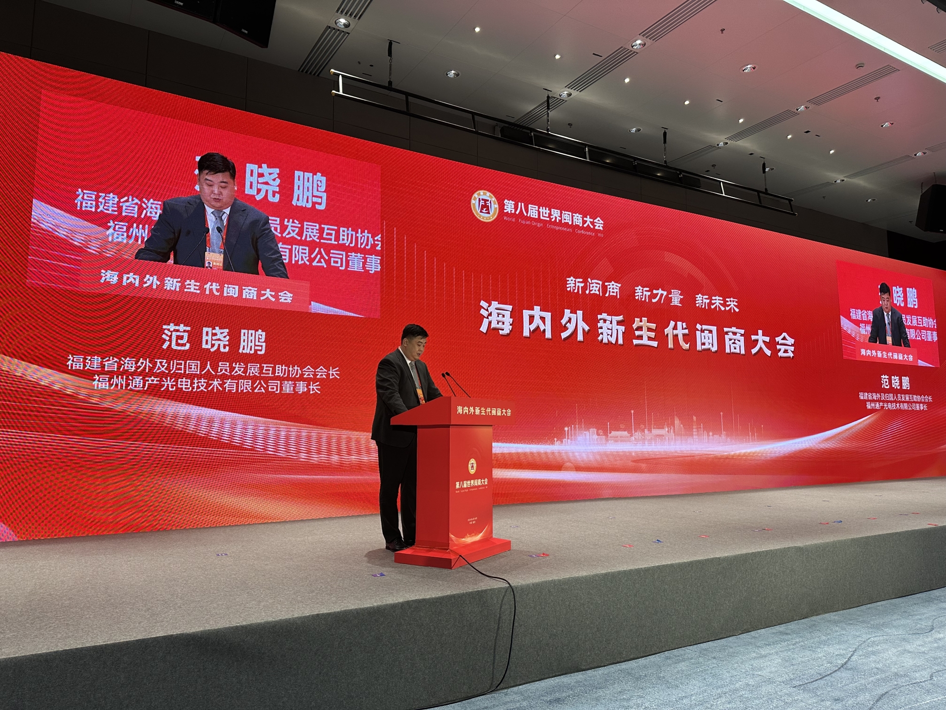 福州通产光电技术有限公司董事长苏晓鹏,指出要传承“敢闯敢试、合群团结、恋祖爱乡”的闽商精神,在全球化浪潮中开辟新赛道。