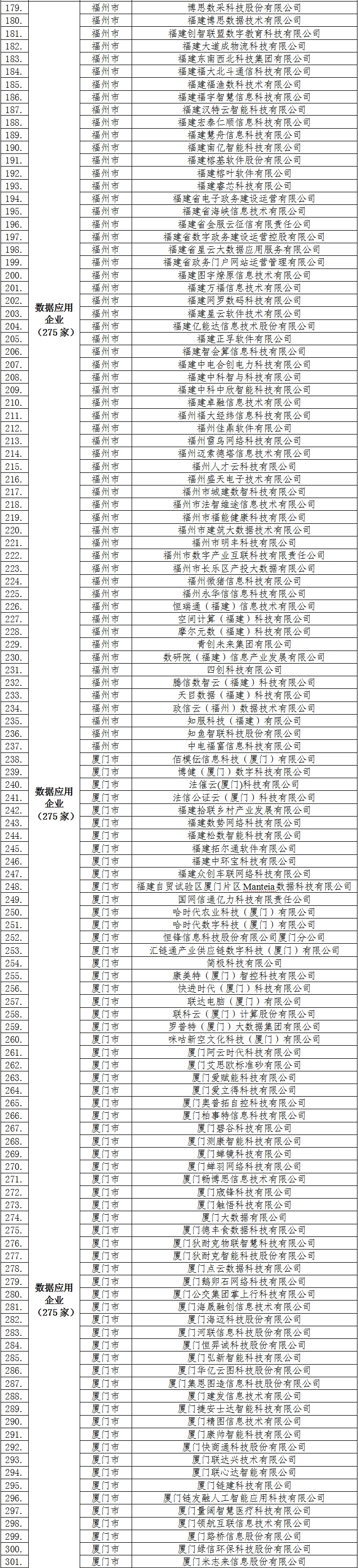 为落实国家关于促进数据产业高质量发展的有关部署,加快培育数据企业主体,发展壮大我省数据产业,助力数字化全面赋能经济社会高质量发展和数字中国建设综合试点建设,我局组织开展了数据企业摸底入库工作,建立我省数据企业培育库。根据《福建省数据管理局关于开展数据企业摸底入库工作的通知》(闽数据〔2025〕16号),经企业申请、县(市、区)确认、设区市数据管理部门复核、专家综合评估、会议研究和名单公示等程序,确定第一批424家企业纳入我省数据企业培育库(部分企业同时符合多个数据企业类型,按类型分类统计共计524条),其中厦门市173家、福州市97家、漳州市32家、泉州市29家、莆田市23家、龙岩市20家、三明市16家、南平市16家、宁德市15家、平潭综合实验区3家,现将名单予以公布。