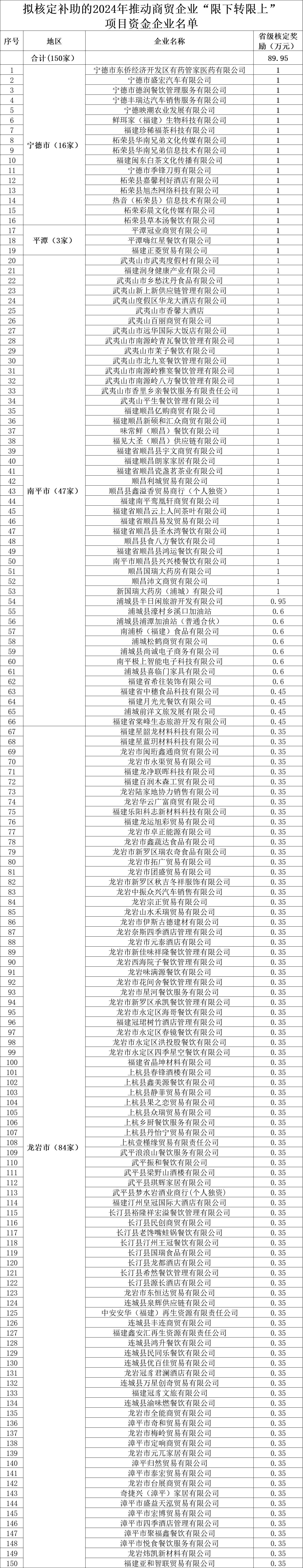 根据《福建省商务厅 福建省财政厅关于印发推动商贸企业“限下转限上”若干措施的通知》(闽商务[2022]200号)、《关于2024年推动商贸企业“限下转限上”项目资金申报工作的通知》(闽商务[2024]167号)等文件精神,2024年我处安排商务发展资金支持地市进一步加大市场主体培育力度,促进更多商贸企业“限下转限上”。按照资金申报通知要求,经地市审核申报、省厅复核、处务会议研究,拟对南平市、宁德市、龙岩市、平潭综合实验区给予鼓励商贸企业“限下转限上”补助资金共计89.95万元。根据《福建省商务发展专项资金管理办法》(联合行文(商务厅代拟财务用专用)[2024]1号)有关规定,现进行公示(详见附件)。公示时间为2025年7月11日至2025年7月17日。如有异议,请于2025年7月17日前实名来电或来访反映监督部门。