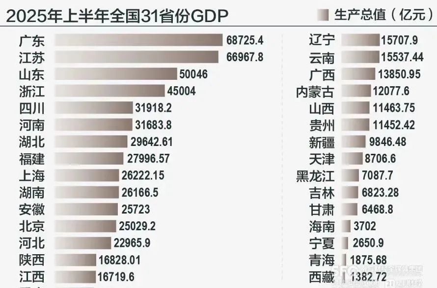 近日,31省份上半年经济数据均已揭晓。东部省份整体经济总量仍然保持领先优势,广东、江苏、山东三省GDP总量仍然位居全国前三,分别达到68725.4亿元、66967.8亿元和50046亿元。