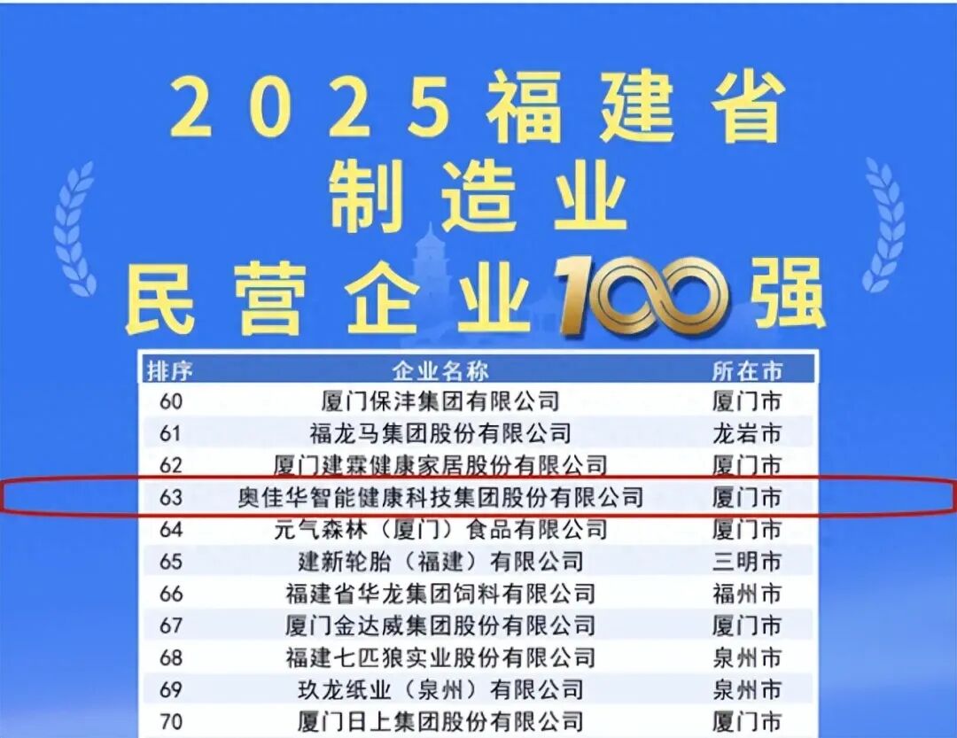 近日,福建省工商联发布了2025福建省民营企业100强、制造业民营企业100强、服务业民营企业100强、创新型民营企业100强四个榜单。来自厦门的按摩器具行业巨头奥佳华集团凭借在智能制造、科技创新领域的卓越表现荣登“制造业民营企业100强”、“创新型民营企业100强”榜单。