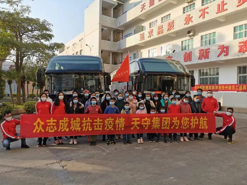 为了让贵州籍返岗人员安全顺利到达公司,天守集团组织公司党员及相关管理员成立党员志愿服务队,派大巴车到美旗城为返岗员工做好接收服务工作。当天,天守集团的服务落实至各个细节,对换乘车辆进行全面消毒,对返岗员工逐一核对身份信息、健康证等,并对员工进行体温测量、消毒,更换口罩,为员工发放饮用水等。目前,天守集团老员工返厂率达八成。