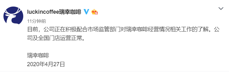 针对传瑞幸咖啡被被公安、工商部门接管以及证监会进驻一事,瑞幸咖啡发布声明称,目前,公司正在积极配合市场监管部门对瑞幸咖啡经营情况相关工作的了解。公司及全国门店运营正常。