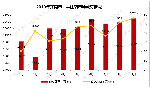 市场成交:2019年9月,东莞市商品住宅销售面积为55.94万平方米,环比上涨8.26%;9月销售均价20743元/平方米,为1-9月销售均价最高。除1月成交均价较低在18346元/平方米,其余2-8月成交均价基本在19000元/平方米以上。