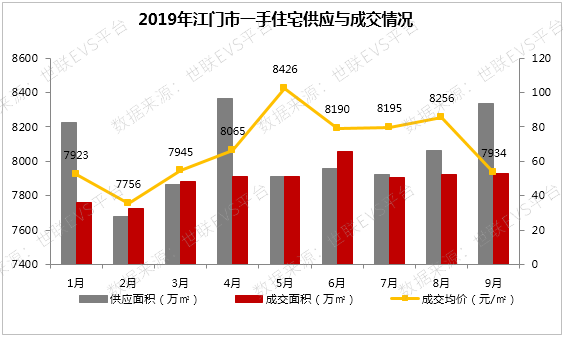 市场供需:2019年1-9月,江门市一手住宅市场基本供大于求,成交量整体较平稳。9月江门市一手住宅供应面积为93.69万平方米,成交面积为53.26万平方米,成交均价为7934元/平方米。