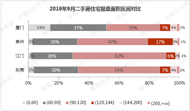 从报盘量来看,四城报盘面积主要集中在60-120 ㎡的区间,其中江门占比达到90%,其次是东莞占比达到84%,厦门主力面积段为60-90 ㎡ ,其余三城主力面积段为90-120 ㎡。