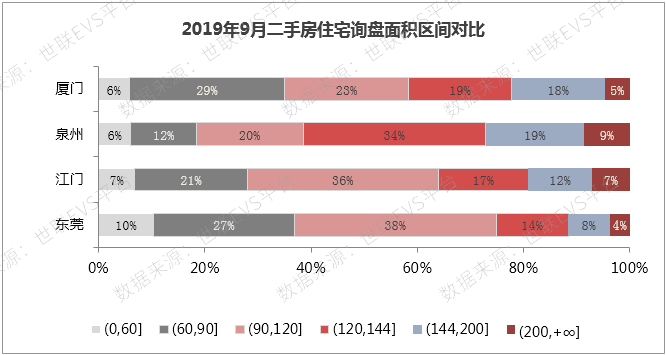 从询盘量来看,除泉州外其余三城主力面积段均为90-120㎡ ,其中东莞、江门主力面积段占比较为突出,与其余面积段占比的差异较大。