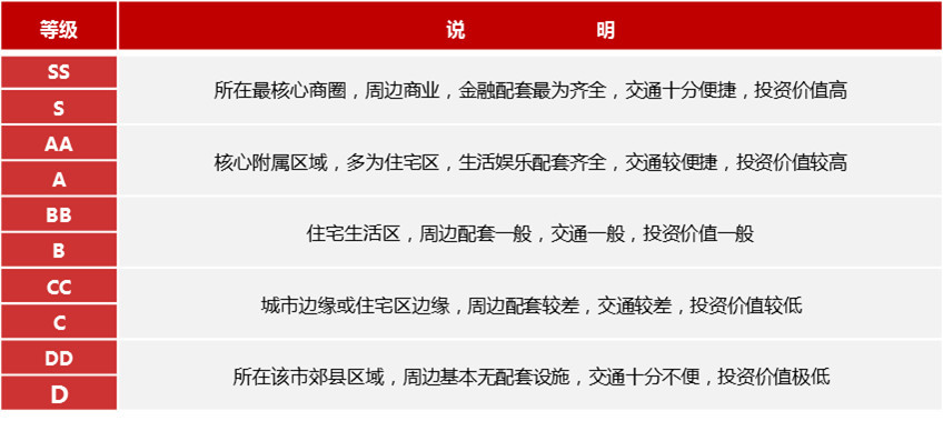 等级越高代表该区域生活娱乐交通配套越齐全,即商圈核心或住宅区重心,整体抗风险能力强,投资价值高;等级越低则相应周边基础设施越少,交通越不便捷,属城市边缘地带,综合投资价值较低。