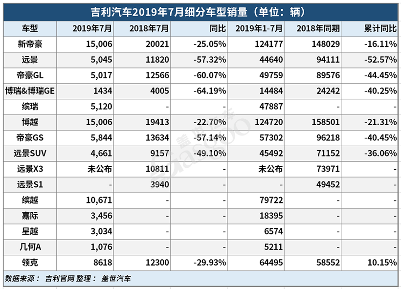 6月国五国六切换,让国内乘用车零售量看到了一些曙光,结束了长达十余月的下滑,但也正是销量的提前透支,无论是企业产销量还是消费者的购买力都进入一段时间的调整期,让本就暗淡的7月变得格外惨淡。这也让吉利汽车尽管较去年多出了6款新车,但车型平均销量由去年的10934辆,跌至今年7月的5375辆。