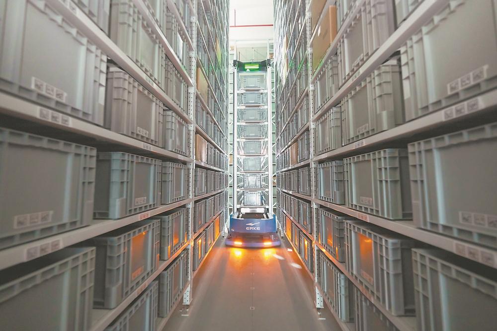 图为鸿星尔克智能仓储物流中心内,一台台装卸机器人有序地穿梭在仓库中,快速精准找到位置并投放货品。