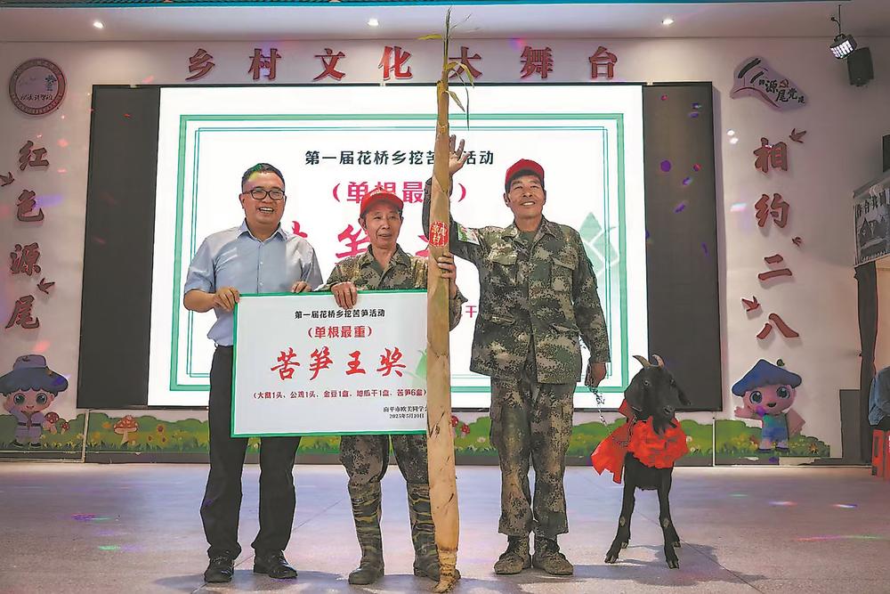 老江是松溪县花桥乡源尾村村民。今年5月,第一届花桥乡挖苦笋活动在源尾村举行,吸引各村村民及游客共八九百人参与。老江与搭档合伙挖出单根最重的笋,拿下“苦笋王奖”;他还助力源尾村参赛队在所有队伍中挖出的笋总量最重,获得“状元笋奖”。奖品包括羊、鹅、鸡、地瓜干等。