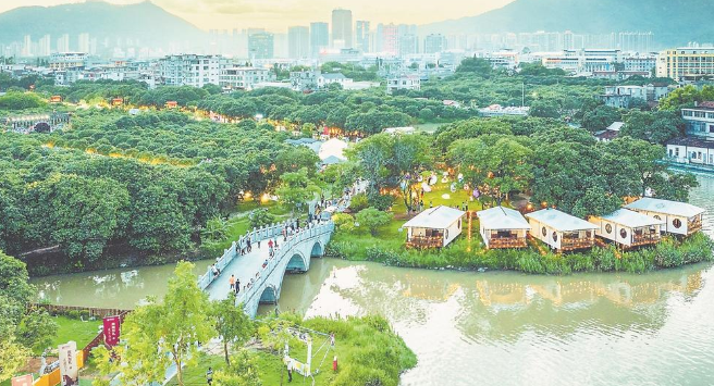 如今,串起沿溪5个村(社区)旅游资源的“水上巴士”等项目已开通。沿溪而下,北大村的亲子露营地、七步村的荔洲岛之夜、东阳村的古厝古桥……一溪碧水,舒展开一片风光带,蕴含着共同的生态价值转换机遇。