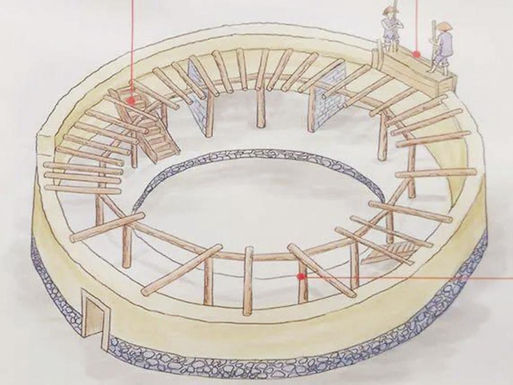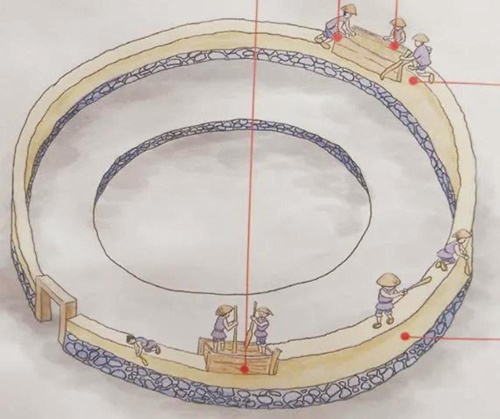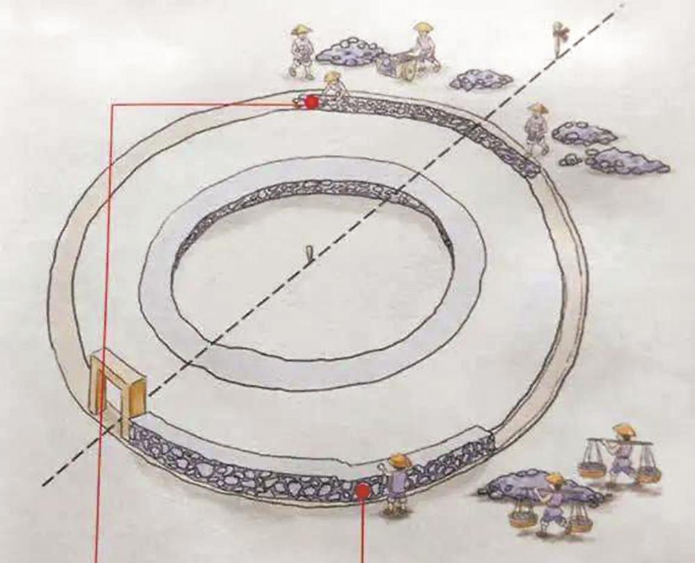 楼基砌好后填土夯实,继续在高出地面的部分以小石料砌出梯形石墙。这道低矮的石墙是“防水墙”,用来保护即将在其上构筑的主墙体不被下雨时的积水侵蚀,同时也可防止地下水沿墙脚向上渗透,有防潮的作用。