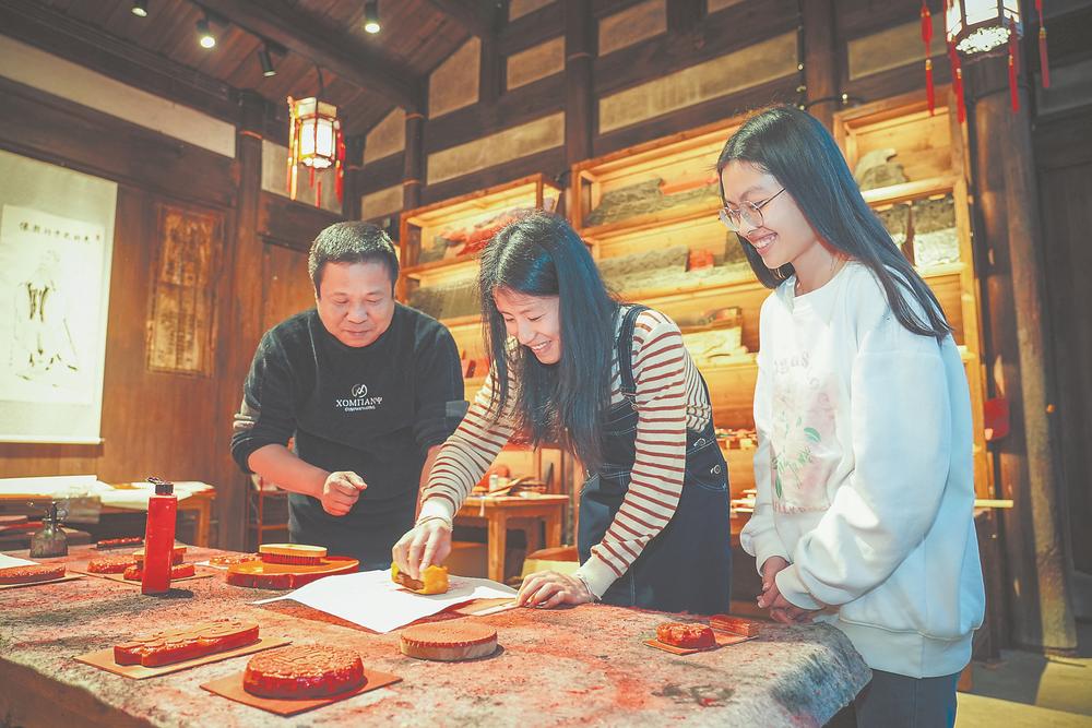 游客在连城四堡体验雕版印刷技艺。章宸睿 摄