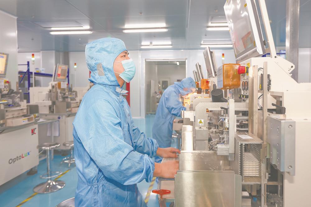 福建晶旭半导体科技有限公司生产车间内,工人在进行焊线操作。 谢泽铧 摄