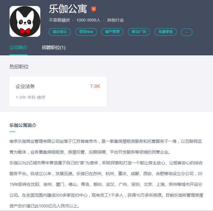 按照乐伽公寓在招聘平台上的介绍,其计划2019年在沈阳、徐州、厦门、佛山、青岛、烟台、武汉、广州、深圳、北京、上海、郑州等城市开设分公司。在全国范围内建成300多家签约中心,现有员工1千多人,获得10万多所房源。目前乐伽所管理房屋资产总价值已达1000亿元人民币以上。